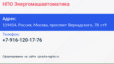 НПО Энергомашавтоматика по адресу 119454, Россия, Москва, проспект Вернадского, 78 ст9 в дальнейшем Организация, размещена в следующих категориях: