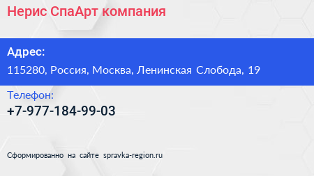 Нерис СпаАрт, компания по адресу 115280, Россия, Москва, Ленинская Слобода, 19 в дальнейшем Организация, размещена в следующих категориях: