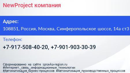 NewProject, компания по адресу 108851, Россия, Москва, Симферопольское шоссе, 14а ст3 в дальнейшем Организация, размещена в следующих категориях: