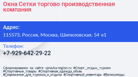 Окна & Сетки, торгово-производственная компания по адресу 115573, Россия, Москва, Шипиловская, 54 к1 в дальнейшем Организация, размещена в следующих категориях: