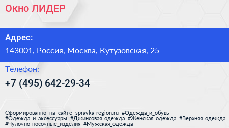 Окно ЛИДЕР по адресу 143001, Россия, Москва, Кутузовская, 25 в дальнейшем Организация, размещена в следующих категориях: