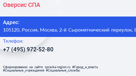 Оверсис СПА по адресу 105120, Россия, Москва, 2-й Сыромятнический переулок, 8 в дальнейшем Организация, размещена в следующих категориях: