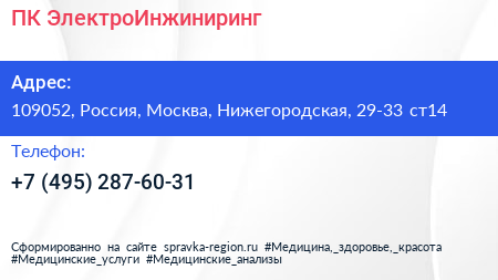 ПК ЭлектроИнжиниринг по адресу 109052, Россия, Москва, Нижегородская, 29-33 ст14 в дальнейшем Организация, размещена в следующих категориях: