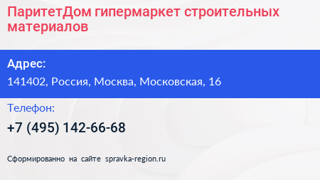 ПаритетДом, гипермаркет строительных материалов по адресу 141402, Россия, Москва, Московская, 16 в дальнейшем Организация, размещена в следующих категориях: