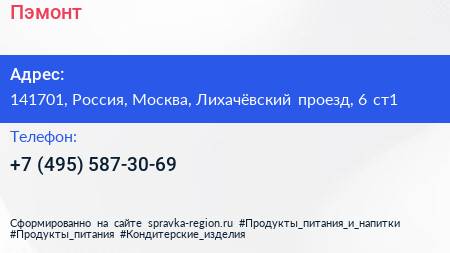 Пэмонт по адресу 141701, Россия, Москва, Лихачёвский проезд, 6 ст1 в дальнейшем Организация, размещена в следующих категориях: