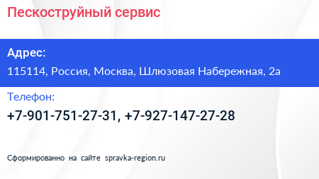 Пескоструйный сервис по адресу 115114, Россия, Москва, Шлюзовая Набережная, 2а в дальнейшем Организация, размещена в следующих категориях: