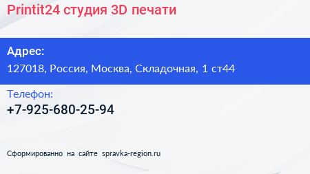 Printit24, студия 3D печати по адресу 127018, Россия, Москва, Складочная, 1 ст44 в дальнейшем Организация, размещена в следующих категориях: