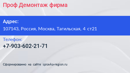 Проф-Демонтаж, фирма по адресу 107143, Россия, Москва, Тагильская, 4 ст21 в дальнейшем Организация, размещена в следующих категориях: