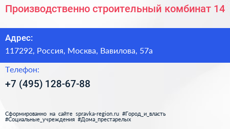 Производственно-строительный комбинат №14 по адресу 117292, Россия, Москва, Вавилова, 57а в дальнейшем Организация, размещена в следующих категориях: