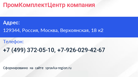 ПромКомплектЦентр, компания по адресу 129344, Россия, Москва, Верхоянская, 18 к2 в дальнейшем Организация, размещена в следующих категориях: