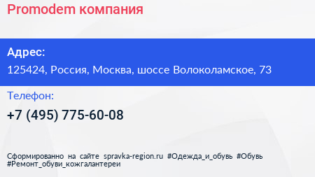 Promodem, компания по адресу 125424, Россия, Москва, шоссе Волоколамское, 73 в дальнейшем Организация, размещена в следующих категориях: