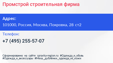 Промстрой, строительная фирма по адресу 101000, Россия, Москва, Покровка, 28 ст2 в дальнейшем Организация, размещена в следующих категориях: