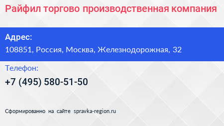 Райфил, торгово-производственная компания по адресу 108851, Россия, Москва, Железнодорожная, 32 в дальнейшем Организация, размещена в следующих категориях: