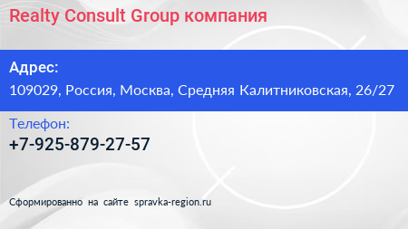Realty Consult Group, компания по адресу 109029, Россия, Москва, Средняя Калитниковская, 26/27 в дальнейшем Организация, размещена в следующих категориях:
