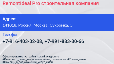 RemontIdeal Pro, строительная компания по адресу 141018, Россия, Москва, Сукромка, 5 в дальнейшем Организация, размещена в следующих категориях:
