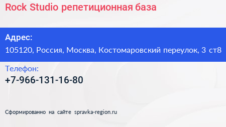 Rock Studio, репетиционная база по адресу 105120, Россия, Москва, Костомаровский переулок, 3 ст8 в дальнейшем Организация, размещена в следующих категориях: