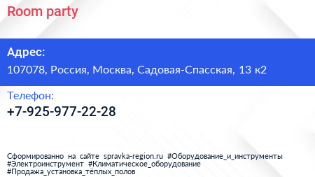 Room party по адресу 107078, Россия, Москва, Садовая-Спасская, 13 к2 в дальнейшем Организация, размещена в следующих категориях: