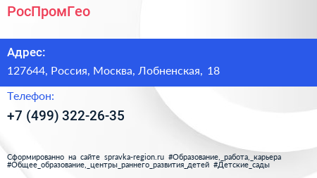 РосПромГео по адресу 127644, Россия, Москва, Лобненская, 18 в дальнейшем Организация, размещена в следующих категориях: