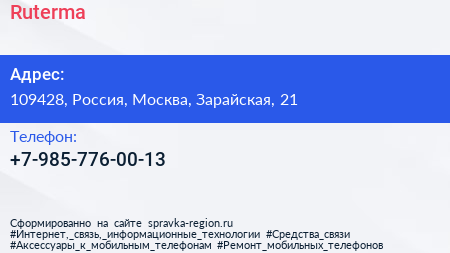 Ruterma по адресу 109428, Россия, Москва, Зарайская, 21 в дальнейшем Организация, размещена в следующих категориях: