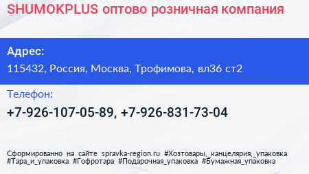 SHUMOKPLUS, оптово-розничная компания по адресу 115432, Россия, Москва, Трофимова, вл36 ст2 в дальнейшем Организация, размещена в следующих категориях: