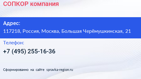 СОПКОР, компания по адресу 117218, Россия, Москва, Большая Черёмушкинская, 21 в дальнейшем Организация, размещена в следующих категориях: