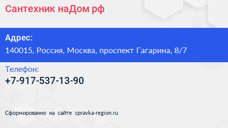 Сантехник-наДом.рф по адресу 140015, Россия, Москва, проспект Гагарина, 8/7 в дальнейшем Организация, размещена в следующих категориях: