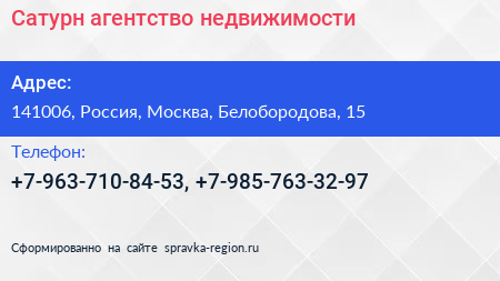 Сатурн, агентство недвижимости по адресу 141006, Россия, Москва, Белобородова, 15 в дальнейшем Организация, размещена в следующих категориях: