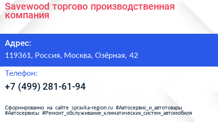 Savewood, торгово-производственная компания по адресу 119361, Россия, Москва, Озёрная, 42 в дальнейшем Организация, размещена в следующих категориях: