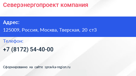 Северэнергопроект, компания по адресу 125009, Россия, Москва, Тверская, 20 ст3 в дальнейшем Организация, размещена в следующих категориях: