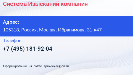 Система Изысканий, компания по адресу 105318, Россия, Москва, Ибрагимова, 31 к47 в дальнейшем Организация, размещена в следующих категориях: