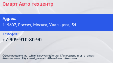 Смарт Авто, техцентр по адресу 119607, Россия, Москва, Удальцова, 54 в дальнейшем Организация, размещена в следующих категориях:
