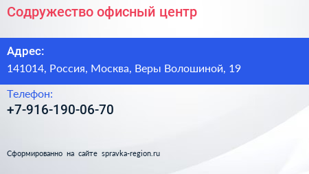 Содружество, офисный центр по адресу 141014, Россия, Москва, Веры Волошиной, 19 в дальнейшем Организация, размещена в следующих категориях: