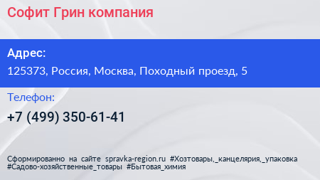 Софит Грин, компания по адресу 125373, Россия, Москва, Походный проезд, 5 в дальнейшем Организация, размещена в следующих категориях: