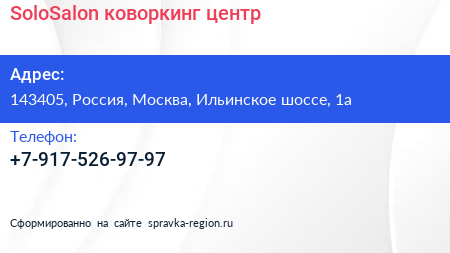 SoloSalon, коворкинг-центр по адресу 143405, Россия, Москва, Ильинское шоссе, 1а в дальнейшем Организация, размещена в следующих категориях: