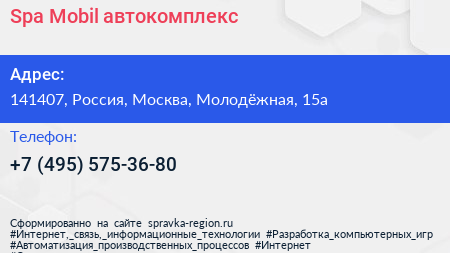 Spa Mobil, автокомплекс по адресу 141407, Россия, Москва, Молодёжная, 15а в дальнейшем Организация, размещена в следующих категориях: