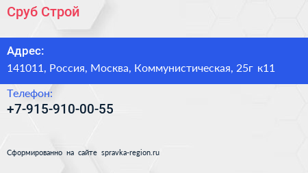 Сруб-Строй по адресу 141011, Россия, Москва, Коммунистическая, 25г к11 в дальнейшем Организация, размещена в следующих категориях: