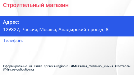 Строительный магазин по адресу 129327, Россия, Москва, Анадырский проезд, 8 в дальнейшем Организация, размещена в следующих категориях: