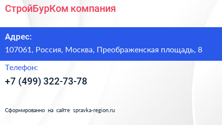 СтройБурКом, компания по адресу 107061, Россия, Москва, Преображенская площадь, 8 в дальнейшем Организация, размещена в следующих категориях: