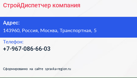 СтройДиспетчер, компания по адресу 143960, Россия, Москва, Транспортная, 5 в дальнейшем Организация, размещена в следующих категориях: