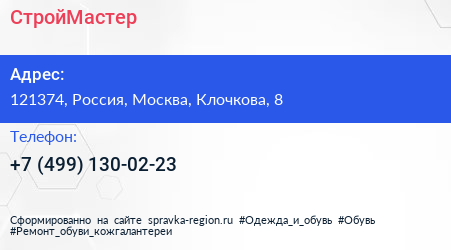 СтройМастер по адресу 121374, Россия, Москва, Клочкова, 8 в дальнейшем Организация, размещена в следующих категориях: