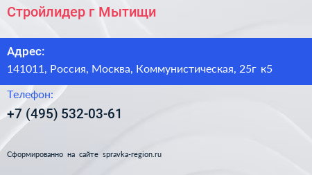 Стройлидер, г. Мытищи по адресу 141011, Россия, Москва, Коммунистическая, 25г к5 в дальнейшем Организация, размещена в следующих категориях: