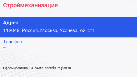 Строймеханизация по адресу 119048, Россия, Москва, Усачёва, 62 ст1 в дальнейшем Организация, размещена в следующих категориях: