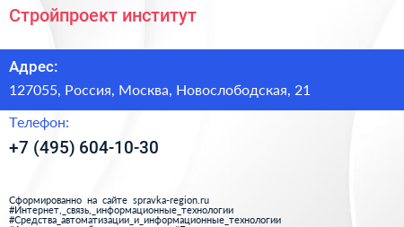 Стройпроект, институт по адресу 127055, Россия, Москва, Новослободская, 21 в дальнейшем Организация, размещена в следующих категориях: