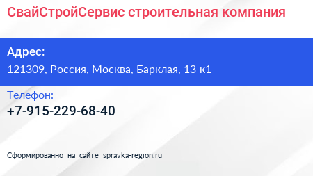 СвайСтройСервис, строительная компания по адресу 121309, Россия, Москва, Барклая, 13 к1 в дальнейшем Организация, размещена в следующих категориях: