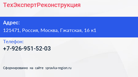 ТехЭкспертРеконструкция по адресу 121471, Россия, Москва, Гжатская, 16 к1 в дальнейшем Организация, размещена в следующих категориях: