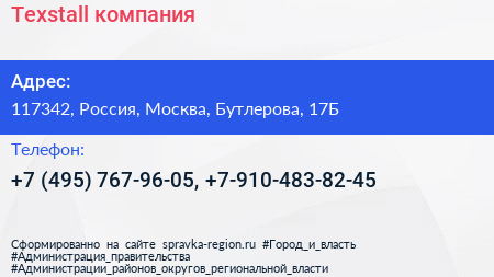 Texstall, компания по адресу 117342, Россия, Москва, Бутлерова, 17Б в дальнейшем Организация, размещена в следующих категориях: