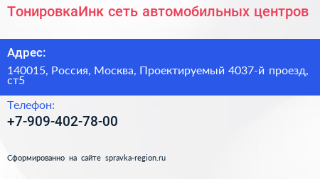 ТонировкаИнк, сеть автомобильных центров по адресу 140015, Россия, Москва, Проектируемый 4037-й проезд, ст5 в дальнейшем Организация, размещена в следующих категориях: