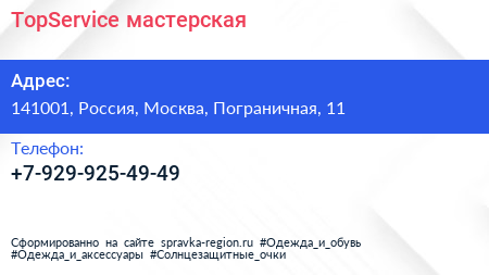 TopService, мастерская по адресу 141001, Россия, Москва, Пограничная, 11 в дальнейшем Организация, размещена в следующих категориях: