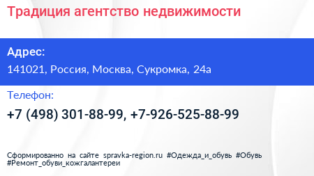 Традиция, агентство недвижимости по адресу 141021, Россия, Москва, Сукромка, 24а в дальнейшем Организация, размещена в следующих категориях: