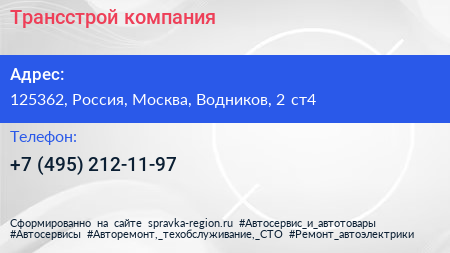 Трансстрой, компания по адресу 125362, Россия, Москва, Водников, 2 ст4 в дальнейшем Организация, размещена в следующих категориях: